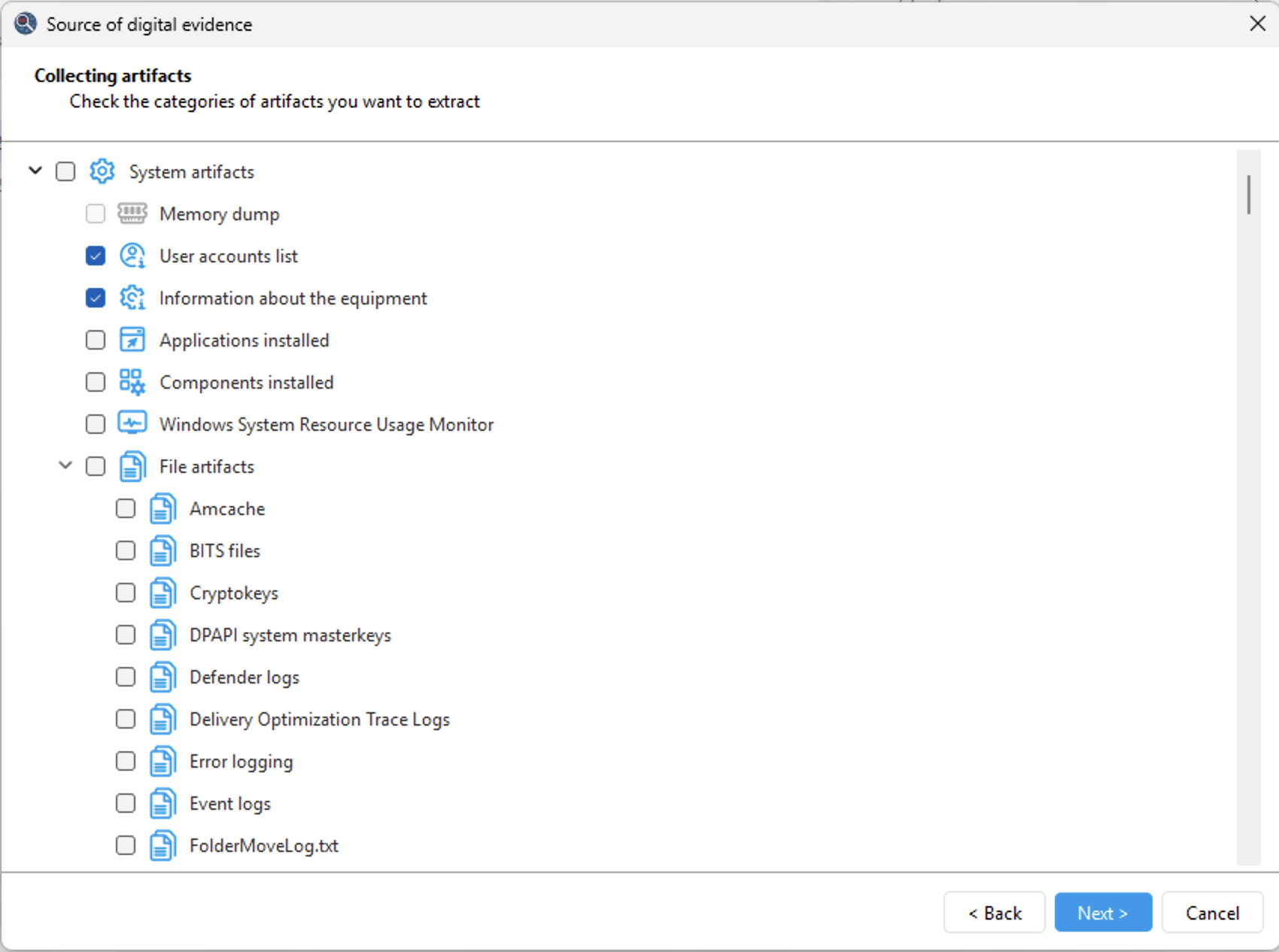 Elcomsoft Quick Triage focuses on extracting the most forensically valuable data from Windows systems, covering hundreds of sources while prioritizing artefacts that are critical for early-stage investigations. The tool targets evidence that helps quickly answer key questions about how a system was used, by whom, when, and for what purpose. It processes data from the operating system itself as well as from a wide range of popular applications that may contain information about user activity, communications, file handling, connected devices, and network usage.