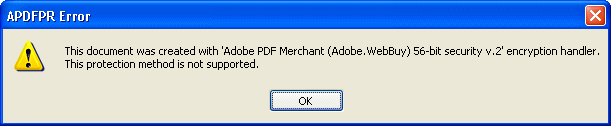 PDF files protected using the Digital Rights Management (DRM) technology or third-party plugins such as FileOpen cannot be decrypted. If you try to start to decrypt such a file, APDFPR will display an error message: